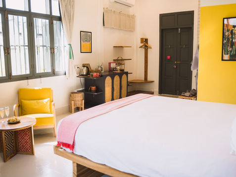 Of a yellow color, 27m2 with a King size bed that can be divided into 2 single beds. A cozy room with beautifully handmade fabric designed by Lao locals to give a special touch to this fruity and comfortable room.